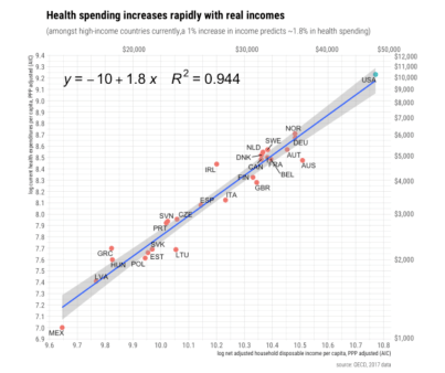 U.S. health care spending is not out-of-line internationally, despite whatever shortfalls our health care system might embody. By that, I mean that health care spending is almost exactly what U.S. income levels would predict based on cross-country statistical evidence. Other countries are certain to spend more as their own incomes grow. Take another look at the relationship shown in the chart above: it predicts that health care spending per capita grows 1.8% for every 1% increase in household income. In fact, the share of consumption devoted to health care rises as income rises. Quite simply, the slope of that curve means that health care qualifies as a luxury good.