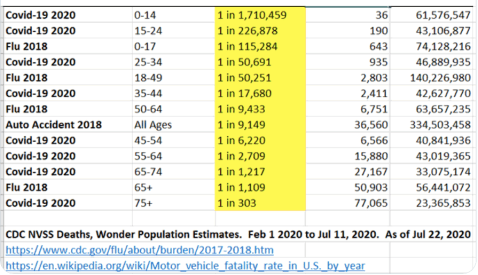 Just for starters, the table at the top of this post (admittedly not particularly well organized) shows calculations of odds from the CDC. These odds might well overstate the risks of both C19 and the flu, as they probably don’t account well for the huge number of asymptomatic cases of both viruses.