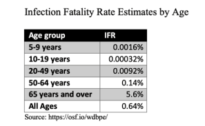 Another glimpse of reality is offered by a recent Swiss study showing the C19 infection mortality rate (IFR) by age, shown below. You can find a number of other charts on-line that show the same pattern: If you’re less than 50 years old, your risk of death from C19 is quite slim. Even those 50-64 years of age don’t face a substantial mortality risk, though it’s obviously higher for individuals having co-morbidities. These IFRs are lower than all-cause mortality for younger cohorts, but higher for older cohorts.