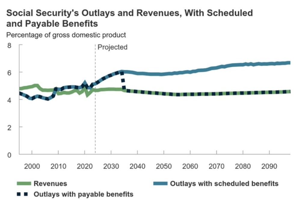 Payroll tax revenue is no longer adequate to pay for current Social Security and Medicare benefits, and the problem is huge: according to the Penn-Wharton Budget Model, the unfunded obligations of Social Security (including old age, survivorship and disability) through 2095 have a present value of $18.1 trillion in constant 2024 dollars (using a discount rate of 4.4%). The comparable figure for Medicare Part A is $18.6 trillion. Together these amount to more than the current national debt.